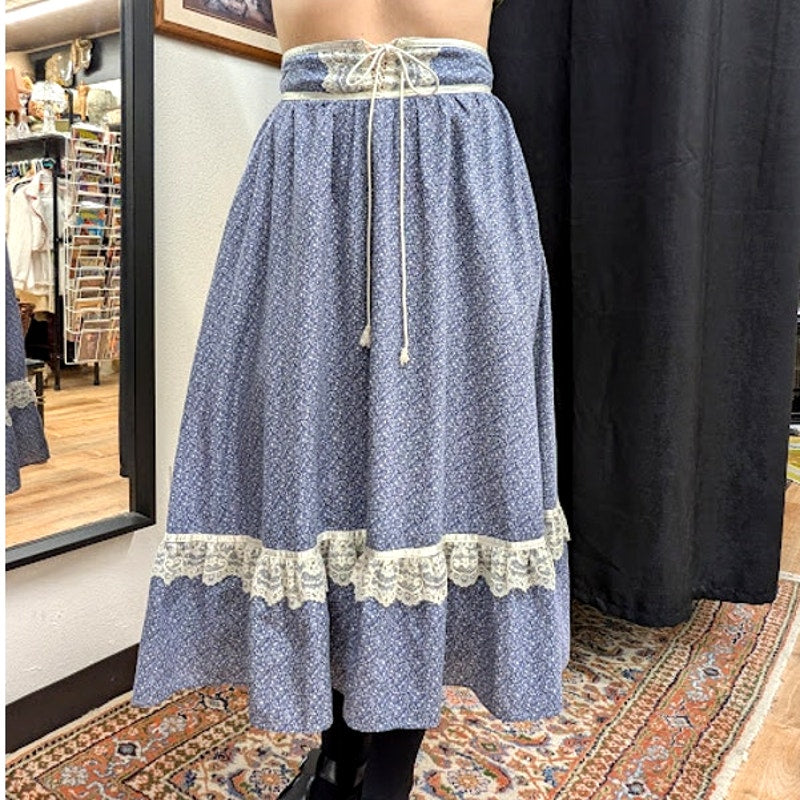 Beautiful vintage Gunne Sax midi skirt featuring a charming blue floral pattern. This skirt is perfect for adding a touch of vintage elegance to your wardrobe. It's in excellent condition and ready to wear!