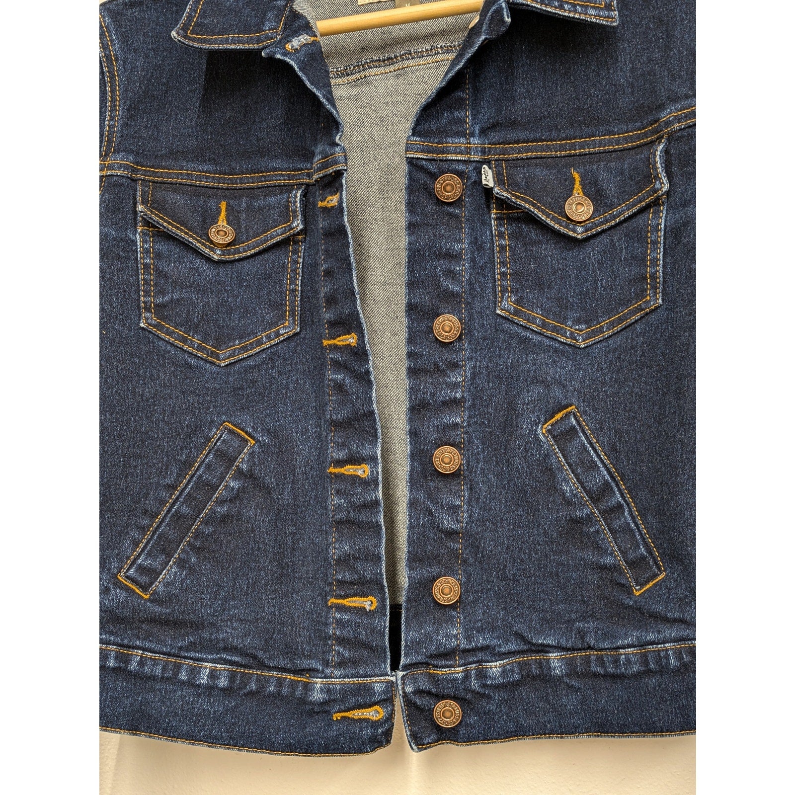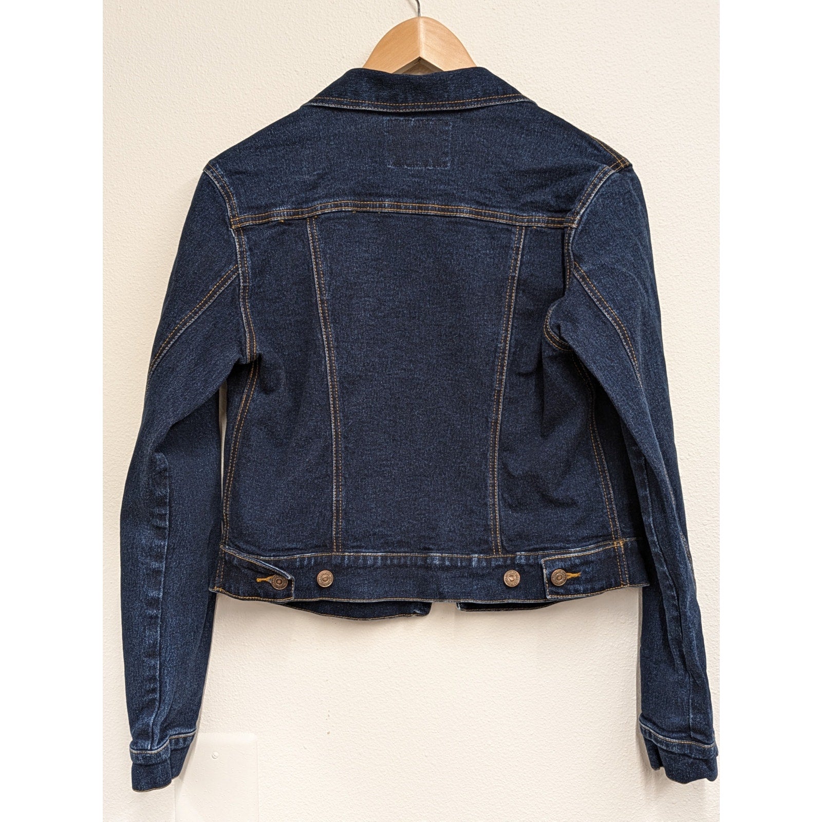 Step up your outerwear with this classic Levi's Women’s Dark Wash Denim Jacket. Made from high-quality dark indigo denim, this jacket has a fitted cut for a flattering, timeless silhouette. It features a button-up front closure and iconic Levi's stitching, with subtle fading and softening for that perfectly broken-in, vintage look. Light signs of wear on the buttons and stitching add character without compromising quality. Whether you’re dressing up or down, this jacket is in great condition and ready to be a go-to layer in your wardrobe.