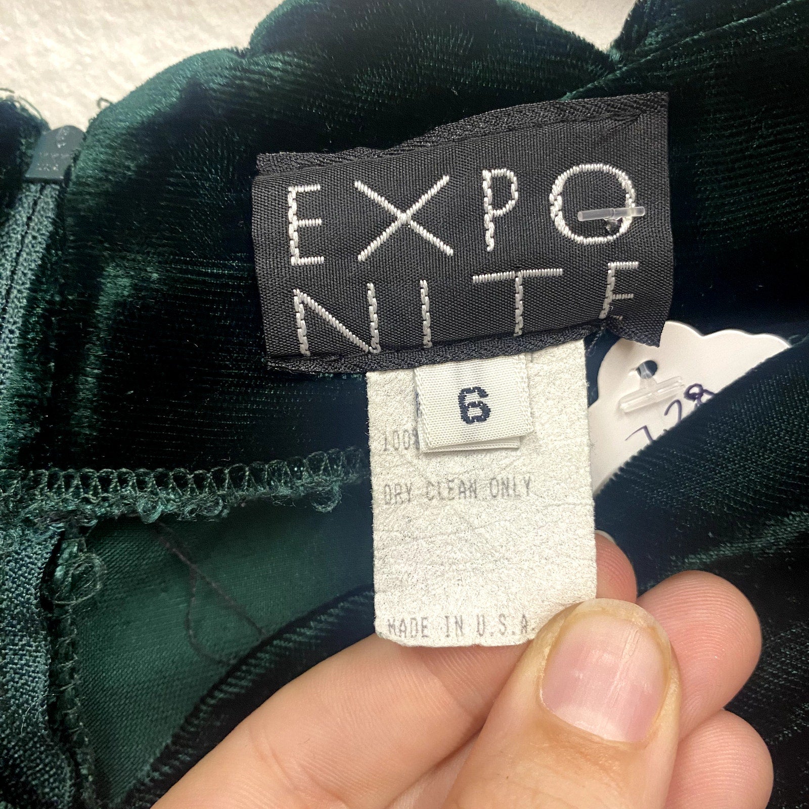 This vintage 80s green velvet Expo Nite dress is a stunning piece that radiates timeless glamour. Made from luxurious green velvet, it has a rich, deep hue and a soft, luminous texture that captures the light beautifully.