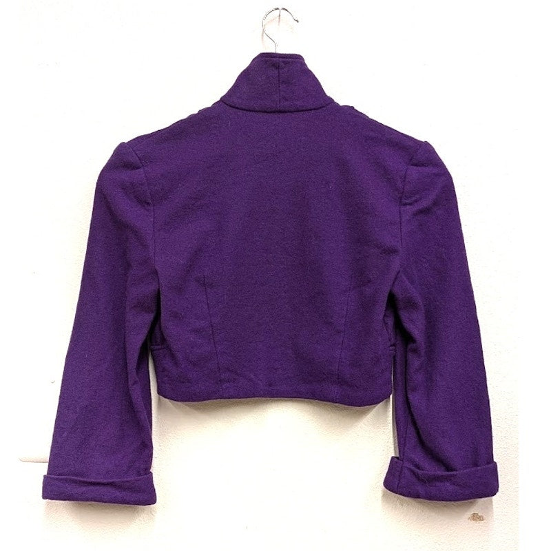 Add a touch of vintage elegance to your wardrobe with this royal purple wool shrug jacket. Crafted in a luxurious fabric, this formal piece exudes sophistication, featuring a refined front button detail and a beautifully tailored silhouette. Ideal for elevating formal or evening ensembles, this shrug jacket is in excellent used condition with no major flaws, though light wear reflects its vintage charm. A stunning and timeless addition to any collection, perfect for those who appreciate classic style with a unique, vintage flair!